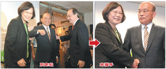 民進(jìn)黨主席蔡英文與蘇貞昌19日“蔡蘇會”,氣氛略顯尷尬。在民進(jìn)黨內(nèi)大佬柯建銘要求下,蔡、蘇才“配合演出”,握手20多秒給媒體拍照,蘇貞昌還打趣說:“我頭發(fā)要不要梳一下?” 圖片來源:臺灣《聯(lián)合報》