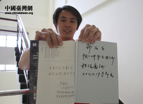 蔡秉憲展示盧彩文老兵和邵應壬老兵的簽名。(中國臺灣網 楊永青 攝)