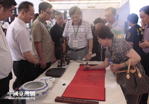 臺灣基層民眾大陸參訪團參觀天津東麗區華明鎮,屏東、桃園、高雄三地民眾代表題字祝福,圖為高雄市代表題字(中國臺灣網 吳捷 攝)