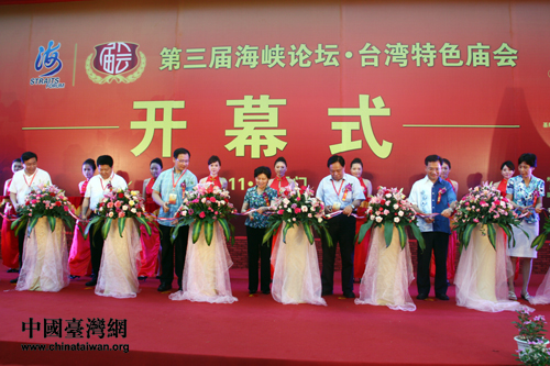 第三屆海峽論壇重要活動之一的臺灣特色廟會今天下午舉行開幕式。圖為參加活動領導為開幕式剪彩。(中國臺灣網 于斯文 攝)