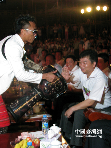 臺灣原住民樂隊(duì)走下舞臺,與觀眾互動,合作演出。(中國臺灣網(wǎng) 馬迪 攝)