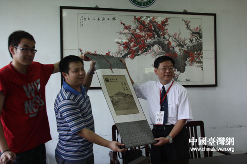 武漢大學學生會負責人與臺灣十大杰出青年基金會團長彭銘淵互贈禮物(中國臺灣網 李丹 攝)