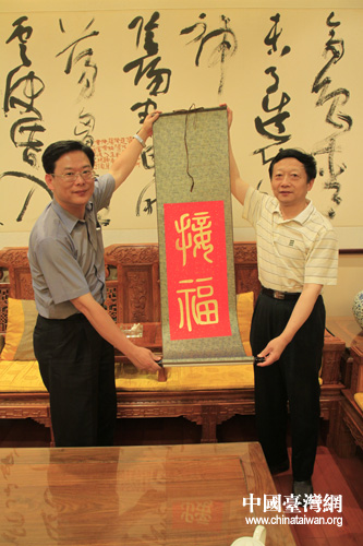 宋慶齡基金會副秘書長喬健與臺灣十大杰出青年辦公室主任彭銘淵交換禮物。(中國臺灣網 趙婧 攝)