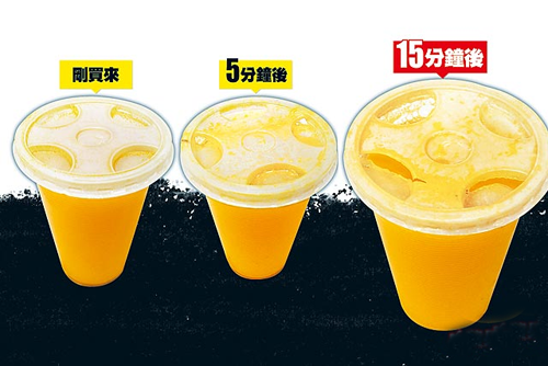 柳橙汁竟在20分鐘內(nèi)溶解部分杯蓋,連檢驗人員也難以置信。圖片來源:臺灣媒體