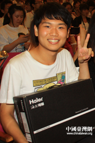 “來之不易的獎杯呀,我得好好看看!”。(中國臺灣網(wǎng) 郜利敏 攝)