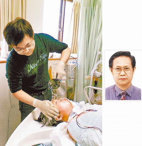 醫(yī)師徐章虎(小圖)插管不當(dāng)導(dǎo)致廖惠麗變成植物人,其夫李永信每天幫妻子洗頭。圖片來(lái)源:臺(tái)灣媒體
