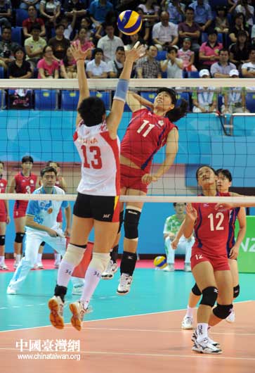 中國隊員13號陳伊娜網前攔截中華臺北隊11號球員吳淑芬的大力扣球。(中國臺灣網 董憲超 攝)