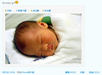 林熙蕾3日晚上在微博po出剛出生的愛女照片。圖片來源:臺(tái)灣《聯(lián)合報(bào)》
