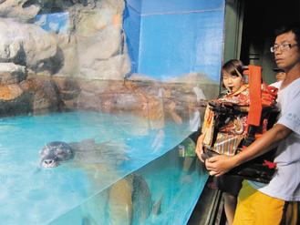 嘉義奉天宮開臺(tái)媽祖臨時(shí)“指示”信徒到臺(tái)灣海洋館參觀,信徒雙手捧著神像“觀賞” 缸里的海豹。圖片來自臺(tái)灣媒體