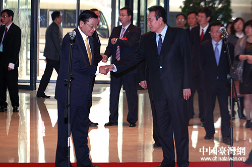 21日下午,海協會會長陳云林在天津賓館與江丙坤率領的海基會協商代表團一行親切話別。(中國臺灣網 陳佳慧 攝)