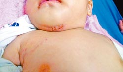 僅僅1個(gè)半月大的小男嬰,全身是傷。(圖片來源于:臺灣《中國時(shí)報(bào)》)
