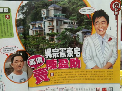 中國臺(tái)灣網(wǎng)11月30日消息 據(jù)臺(tái)灣媒體報(bào)道,地下賭盤總賭頭陳盈助從島內(nèi)政壇延燒到文藝界,今天出刊的臺(tái)灣《壹周刊》報(bào)道,藝人吳宗憲今年為周轉(zhuǎn)公司財(cái)務(wù),急售臺(tái)北挹翠山莊的豪宅,曾委托房仲欲賣新臺(tái)幣4億多元,始終找不到買主。