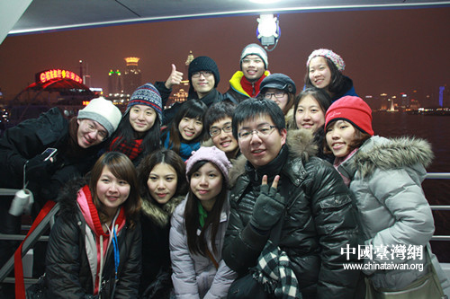 臺灣學生和大陸高校志愿者在黃浦江游輪上合影。(中國臺灣網 栗琰 攝)