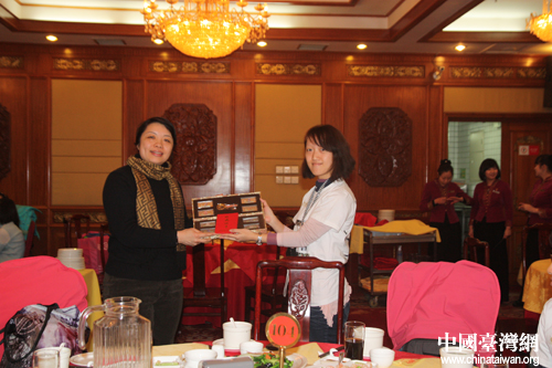 中國宋慶齡基金會聯絡部部長陳愛民(左)和臺灣夏潮基金會人員互贈禮物 (中國臺灣網 王新妍 攝)