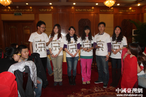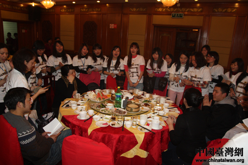 在歡迎晚宴上,6名來自中國地質大學的志愿者唱了歌曲《北京歡迎你》來表達他們對于遠道而來的臺灣青年朋友的歡迎,而臺灣的青年學子則集體演唱了《臺灣心跳聲》,最后兩岸的青年學子共同演唱了歌曲《我們的心》。