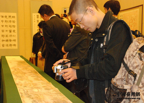 嘉賓們認(rèn)真參觀現(xiàn)藏于臺(tái)北故宮博物院的清院本《清明上河圖》。(中國臺(tái)灣網(wǎng) 劉瑩 攝)