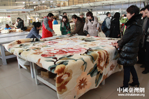 記者們對維信公司高檔精美的毛毯制品贊不絕口。(中國臺灣網 王怡然 攝)