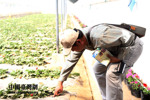 臺灣基層民眾代表在草莓種植區研究土壤。(中國臺灣網發 張成標 攝)