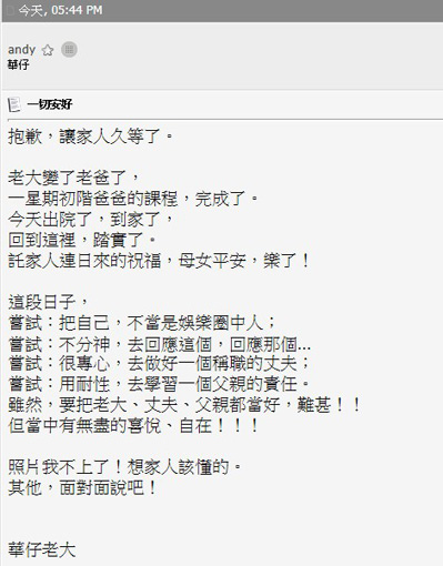 華仔說,“抱歉,讓家人久等了”,“老大(華仔自稱)變了老爸了”,文中感慨他已完成一星期初階爸爸的課程,同時報告母女平安。華仔表示,這段日子他試著全心全意當個稱職的丈夫,先不把自己當成一個藝人,雖然要把老大、丈夫、父親都當好很難,但他坦言“當中有無盡的喜悅、自在”。