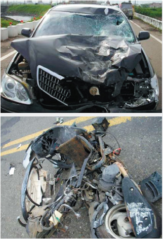 彰化縣民酒駕撞上摩托車,引擎蓋全毀。張東敏夫婦騎乘的摩托被撞到變形。