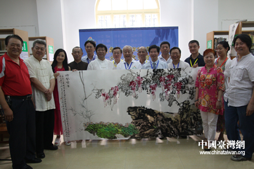 “情系齊魯——兩岸文化聯誼行”之兩岸文化交流筆會7月2日在濟南大明湖畔舉行。圖為兩岸畫家合作的大幅畫作。(中國臺灣網 蕪同 攝)