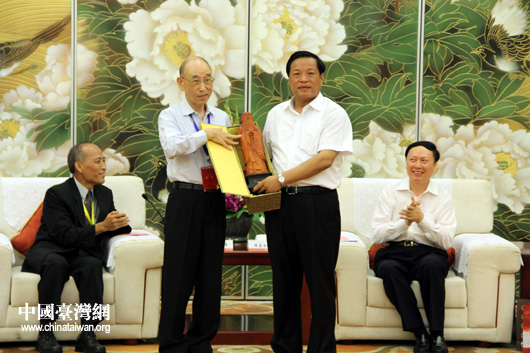 山東省委常委、統(tǒng)戰(zhàn)部部長顏世元向參加“情系齊魯”活動的臺灣嘉賓贈送孔子像。(中國臺灣網 芮益芳 攝) 第1頁第2頁第3頁