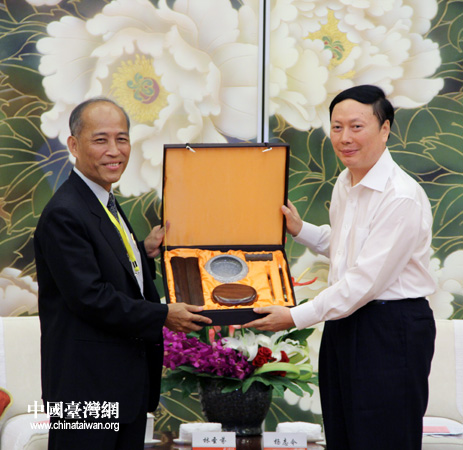 文化部副部長、中華文化聯誼會顧問楊志今向參加“情系齊魯”活動的臺灣嘉賓團團長林圣芬贈送特色禮品。(中國臺灣網 芮益芳 攝)