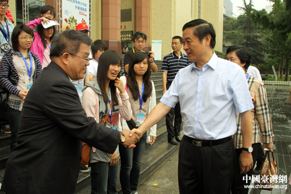 應(yīng)中共四川省委書記劉奇葆邀請,臺灣云林縣、南投縣和彰化縣的105名師生,由臺灣民意代表馬文君、王惠美帶隊,赴四川參加第三屆“臺灣學(xué)生天府夏令營”活動。圖為劉奇葆與臺灣師生親切握手。(中國臺灣網(wǎng) 王偉 攝)