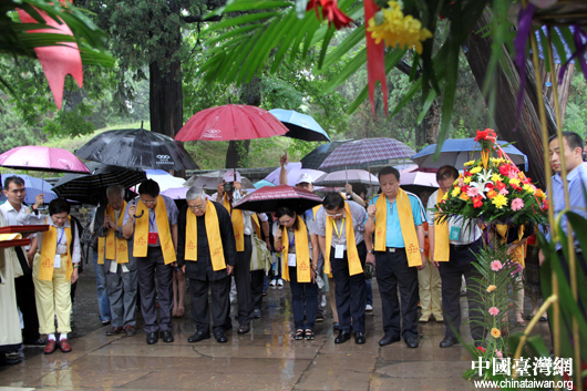 中國臺灣網7月7日曲阜消息 2012年7月5日,參加“情系齊魯——兩岸文化聯誼行”活動的臺灣文化界人士,來到曲阜孔林。天上下起了淅淅瀝瀝的雨,增添了幾分肅穆的氣氛。臺灣文化界人士穿過兩側的千年松柏,來到孔子墓前,時間仿佛凝固。