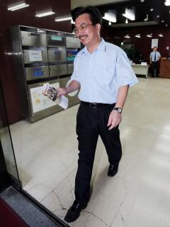 圖為陳君圣步出臺檢方特偵組。圖片來自臺灣“中央社”