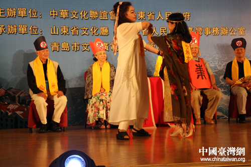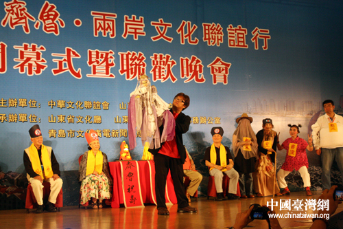 4號車表演的“逍遙群俠齊魯祝壽”,表現(xiàn)臺灣布袋戲中的神話人物來到孔孟之鄉(xiāng)為孔子祝壽,臺灣著名畫家劉國松飾孔子。(中國臺灣網(wǎng) 蕪同 攝)