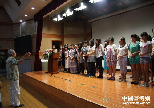 講座結束后,臺灣成功大學教授王偉勇指導學生們吟誦古詩詞。(中國臺灣網 李瑞艷 攝)