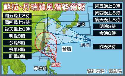 另外,位于日本東南方海面的熱帶性低氣壓昨晨也增強為第10號臺風丹瑞(Damrey,柬埔寨命名,原意為象),預估此臺風對臺灣沒有直接影響,因相距2500公里,現階段不會有交互作用。(中國臺灣網 杜美瑩)