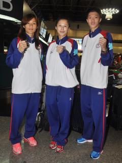 今日,肩負(fù)倫敦奧運(yùn)奪金希望的中華臺(tái)北跆拳道代表隊(duì)啟程前往倫敦,選手魏辰洋(右起)、楊淑君及曾櫟騁,都信心滿滿。 圖片來源:臺(tái)灣媒體