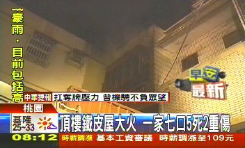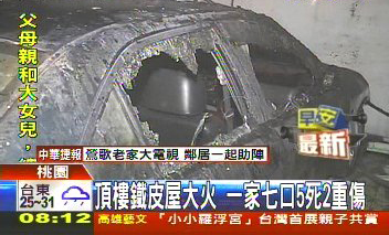 中國臺灣網8月10日消息 據臺灣媒體報道,今天凌晨在桃園中壢發生一起重大火警,就在大家正熟睡的時候,巷弄內的一棟3層樓突然竄出陣陣濃煙,火舌迅速延燒,短短10多分鐘,整棟房子被燒的面目全非,睡在一樓82歲中風的爺爺,因為行動不便無法順利逃生,其他的家人只能往4樓加蓋的鐵皮屋奔逃,但是被濃煙嗆傷,爸媽、奶奶和大女兒4人活活被燒死,大兒子和小女兒緊急從4樓陽臺跳下逃生,卻摔成重傷。