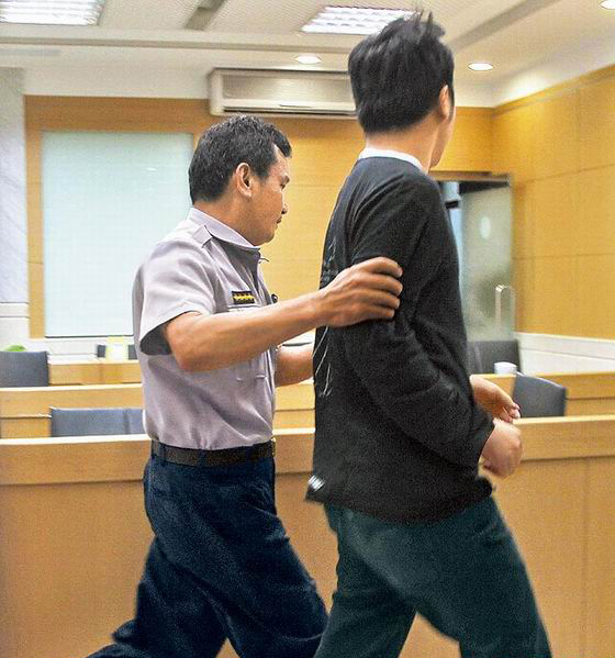 李宗瑞(右)逃亡23天,昨晚向臺北地檢署投案,在法警陪同下,快跑進入法警室。(圖片來自臺媒)