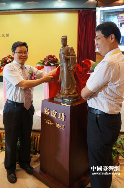 全國臺聯文宣部部長楊毅周(左)與臺灣南美會理事長陳啟村(右)共同為鄭成功像揭幕(中國臺灣網 陳寧 攝)