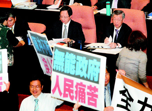臺“立法院”昨天舉行“院會”,雖然臺當局“行政院”已宣布電價緩漲,民進黨“立院”黨團仍于“院會”正式提出對臺當局“行政院長”陳沖不信任案,臺聯黨團也予以支持,兩黨于議場內高喊“換‘內閣’、救經濟”,臺當局“行政院長”陳沖(后右一)也因此無法上臺進行施政報告。圖片來源來源:臺灣《聯合報》