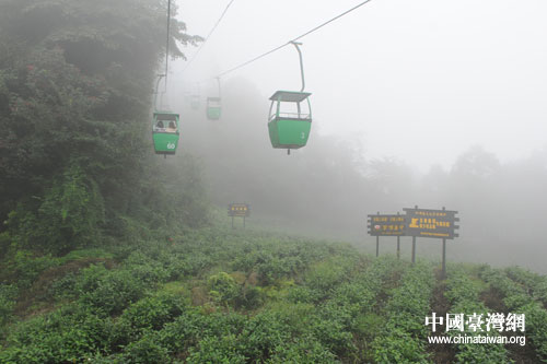 離開名山茶馬司遺址,兩岸記者乘坐纜車奔向蒙頂山。這里獨特的氣候,為優質茶葉的生長提供了澹的條件。放眼望去,煙霧繚繞中是片片茶田。(四川省臺辦供圖)
