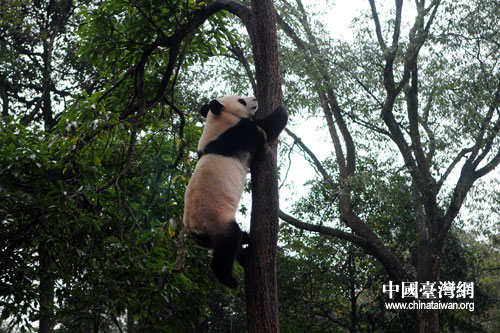 爬樹的大熊貓(中國臺灣網 王曉蕊 攝)