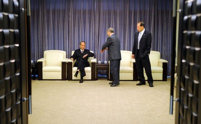 林中森看手表準(zhǔn)備出席他在海基會(huì)的第1場(chǎng)記者會(huì)。圖片來源:臺(tái)灣“中央社”