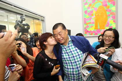 黎智英下班前與員工合照簽名,在辦公室里造成騷動。圖片來源:臺灣媒體