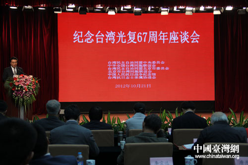 中國臺灣網(wǎng)10月21日北京消息 10月21日,由臺盟中央、全國臺聯(lián)及北京市臺盟、臺聯(lián),中國人民抗日戰(zhàn)爭紀(jì)念館、臺灣抗日志士親屬協(xié)進(jìn)會聯(lián)合舉辦的“紀(jì)念臺灣光復(fù)67周年座談會”在中國人民抗日戰(zhàn)爭紀(jì)念館舉行。