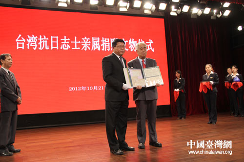 中國臺灣網(wǎng)10月21日北京消息 2012年10月21日上午,為紀(jì)念中國人民抗日戰(zhàn)爭勝利67周年、臺灣光復(fù)67周年,臺盟中央、全國臺聯(lián)及北京市臺盟、臺聯(lián),中國人民抗日戰(zhàn)爭紀(jì)念館、臺灣抗日志士親屬協(xié)進(jìn)會,共同在中國人民抗日戰(zhàn)爭紀(jì)念館舉行臺灣抗日志士親屬捐贈文物儀式。
