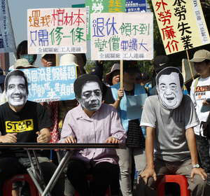 現場抗議民眾戴上畫有馬英九頭像的面具,諷刺當局勞工政策。(圖片來自臺媒)