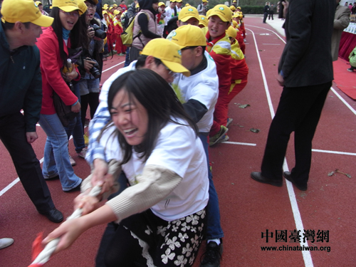 最激烈的集體項目拔河比賽在6(一)班和6(二)班進行,頂新各有五名大哥哥大姐姐加入雙方比賽,看他們多賣勁。(中國臺灣網記者 蕪同攝)