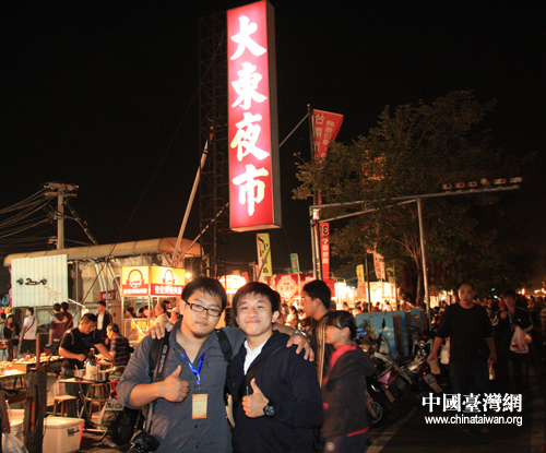 北交大學生莫高泉與成功大學學生劉韋億在臺南大東夜市(中國臺灣網 王文英 攝)