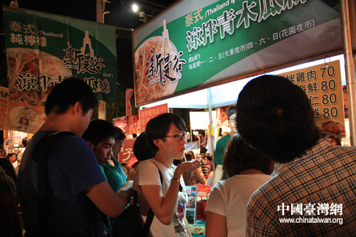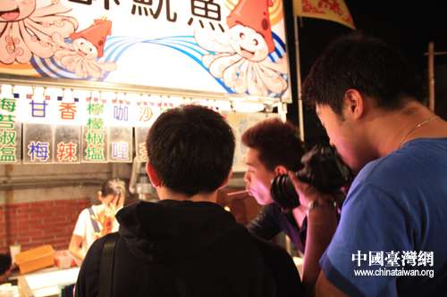 大陸大學生在臺灣學生邀請下在臺南大東夜市品嘗美食(中國臺灣網 王文英 攝)