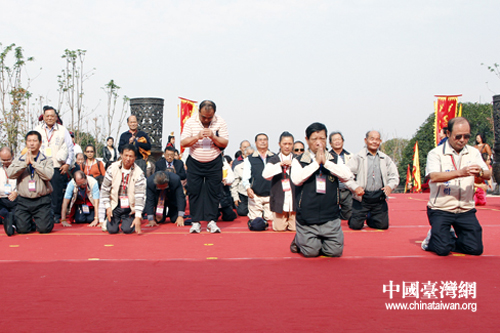 中華神農(nóng)大帝協(xié)進會信眾向中華始祖炎帝神農(nóng)氏的金身寶像行三跪九叩大禮。(中國臺灣網(wǎng) 陳睿 攝)