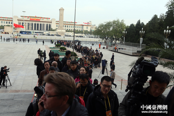 8日上午9時,中國共產黨第十八次全國代表大會將在京開幕。而來自國內外的媒體記者,也構成了人民大會堂前一道靚麗的風景。圖為7日下午,記者們排隊進入人民大會堂采訪十八大首場新聞發布會。(中國臺灣網 王偉 攝)